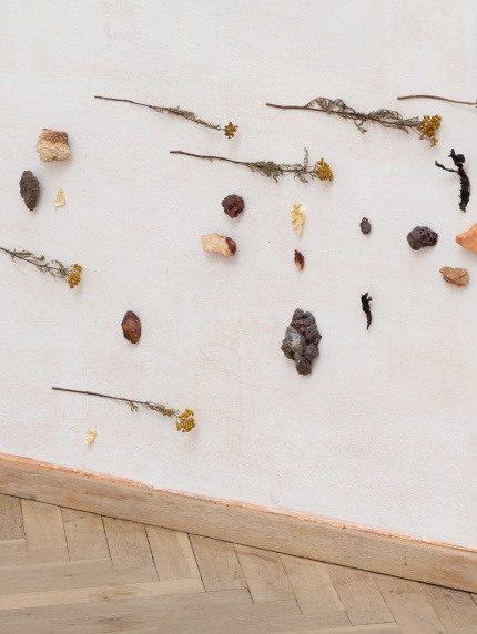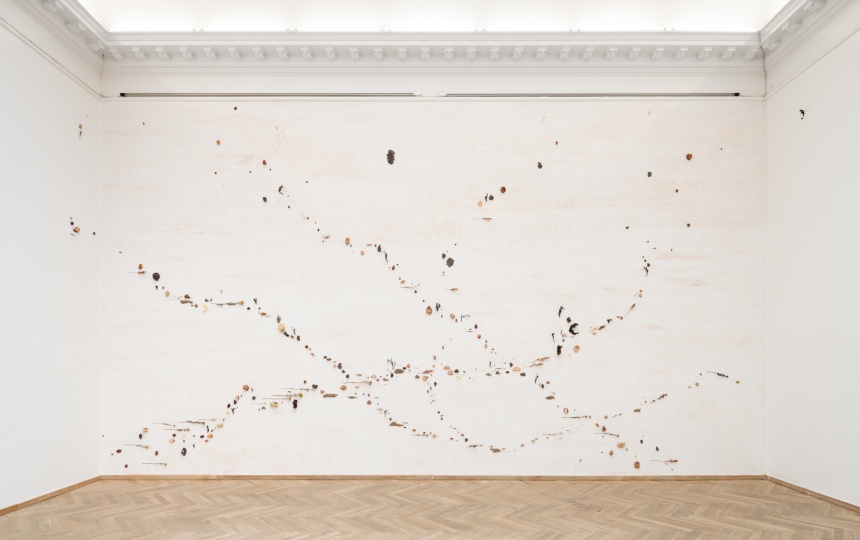 ”Ida Raselli folder sin praksis ud over et gigantisk vægværk, der stramt komponeret bevæger sig hen over væggen som musik, eller som et sprog. Der foregår i hvert fald en form for tegnsætning i den måde stykker af tørret natur og bladguld skrider frem over fladen.”
