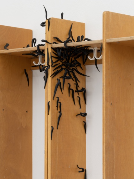 ”Den gamle børnehavegarderobe i træ er en readymade, de fleste kender fra deres barndom, eller fra vores daglige møde med velfærdsstatens børnehaver. Garderoben er højt ophængt på væggen og det overraskende greb akkompagneres af de påsatte sorte plastik-igler, der klumper sig sammen på træet. Barndomsglimtet får et sært skær af uhygge og samfundskritik.”