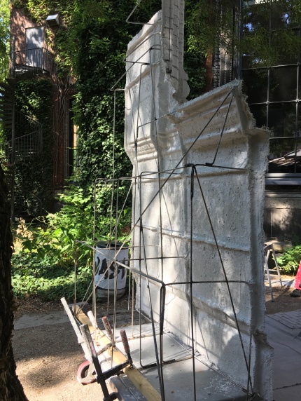 ”Værket er lavet af jesmonite med en forstærkning af rustfrit stål. Det er støbt i beton i jorden otte steder, så det er ret holdbart. Det burde kunne stå imod frost, vind, regn, sol i mange år. Naturen har allerede påvirket værket – skulpturens sokkel er blevet beskidt af jord på samme måde som den originale facade fra Billedhuggerhaven i København. Måske vil planter også begynde at gro op af muren.” fortæller Adam Fenton.