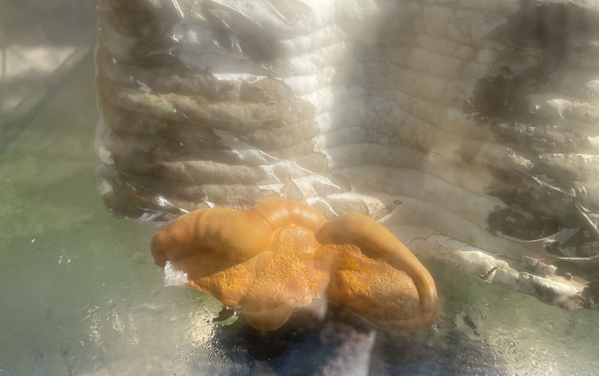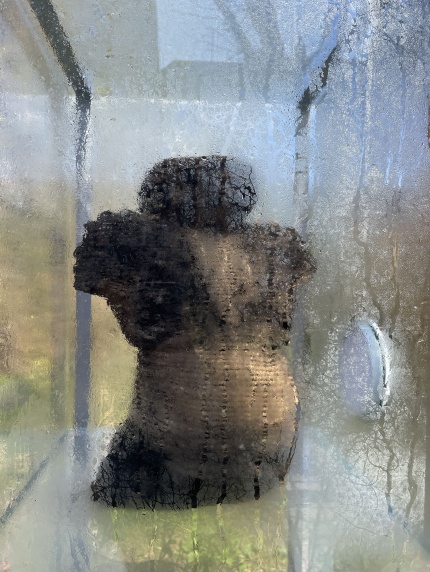 Skulpturerne er printet i et myceliumbaseret materiale – af ler, træmel og mycelium, og står som levende former i en glasmontre i Museions have.