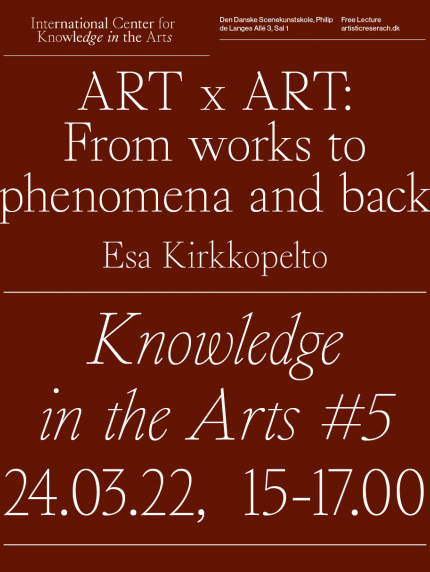 We warmly invite you to the fifth Knowledge in the Arts event which this time will be with the artist, researcher and performer Esa Kirkkopelto. In his presentation , “ART x ART: From works to phenomena, and back”, Kirkkopelto will discuss the object of artistic research in relation to artistic processes and transdisciplinary work, aiming at no less than a reformulation of how to think and work with phenomena, artistically.