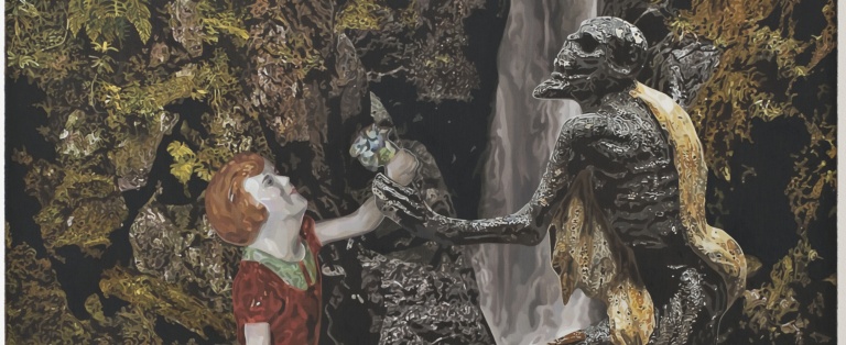 Mathew Weir’s paintings utilise fragments of pre-existing imagery, drawing on a specific tradition of eighteenth and nineteenth century decorative art; the ceramic figurine, as well as more culturally loaded objects and art historical references. Placed within textured and detailed backdrops or isolated, the object as subject is laboriously rendered in paint to explore its inherent or suggestive content. Concerned with how understanding and meanings shift and/or change through time, the focus of interpretation moves between violence and exploitation, cruelty and tenderness, death and innocence. Painting’s ability to parallel and slow down the thoughts these questions pose, enables contrasting psychological and visual elements to sit side by side.
